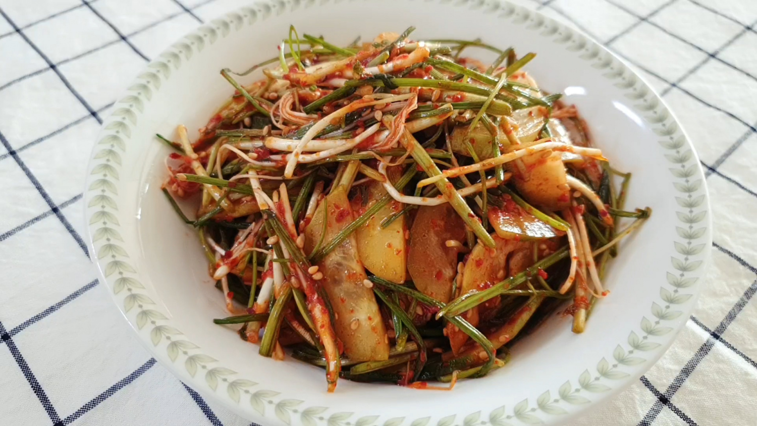 Esta vibrante ensalada combina la aromática cebolleta salvaje (dallae), de temporada en primavera, con la jugosa y crujiente textura del pepino. Se aliña con una vinagreta equilibrada, ligeramente picante, ácida y dulce, que realza los sabores naturales de los ingredientes. Es el acompañamiento perfecto para un tazón de arroz caliente, transportando la esencia de la primavera a su mesa. Una opción sencilla pero llena de sabor que abrirá su apetito.