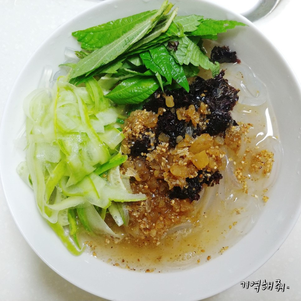 Coloca el agar-agar preparado en un bol amplio. Dispón artísticamente los coloridos y frescos aderezos que has preparado encima. Una vez que el pepino, las hojas de perilla y las cebolletas estén bien colocados, rocía generosamente el delicioso aderezo que hiciste anteriormente sobre todo. Para un sabor extra refrescante y limpio, añade una cantidad adecuada de agua fría. ¡Tu deliciosa ensalada de agar-agar está ahora completa! Puedes añadir unos cubitos de hielo para una experiencia aún más refrescante. ¡Que aproveche!