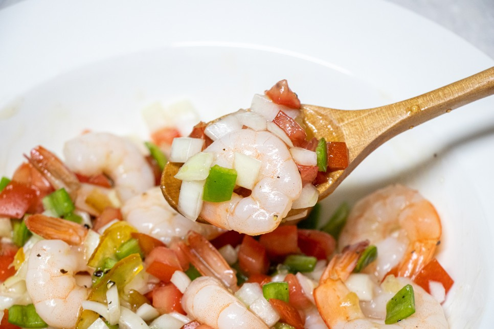 Disponga los camarones escurridos y las verduras picadas (tomate, cebolla y pimiento) de manera atractiva en un plato de servir o en una ensaladera. Los vibrantes colores de los ingredientes harán que la ensalada sea visualmente apetitosa.
