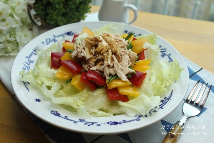 Ahora, preparemos las verduras para la ensalada. Lave la lechuga bajo agua corriente o sumérjala brevemente en agua fría o con hielo. Luego, escúrrala bien para asegurar la máxima frescura y crujido. Coloque la lechuga escurrida generosamente en un plato para servir. Lave los cebollinos frescos y córtelos en longitudes de aproximadamente 5 cm. Finalmente, coloque artísticamente las tiras de pimientos de colores y los cebollinos cortados sobre la lechuga en el plato. Escurra la lata de pechuga de pollo y coloque la pechuga de pollo encima. ¡Su ‘Ensalada de Pechuga de Pollo con Ginseng Rojo’, llena de sabor y salud, está ahora completa! Sírvala con el aderezo frío y disfrute.
