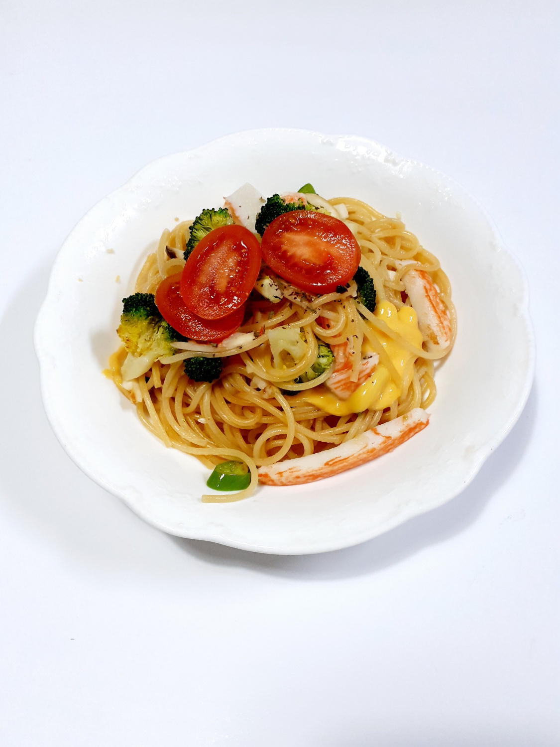 Reduce el fuego a bajo y coloca las 2 lonchas de queso sobre los espaguetis. A medida que el queso comience a derretirse, mezcla suavemente la pasta, las verduras y los palitos de cangrejo con unas pinzas o un tenedor hasta que todo esté bien combinado y cubierto con la cremosa salsa de queso derretido. Prueba y añade una pizca muy pequeña de sal si es necesario para ajustar el sazón. ¡Sirve inmediatamente caliente! También puedes añadir tomates cherry cortados por la mitad para un toque de frescura.