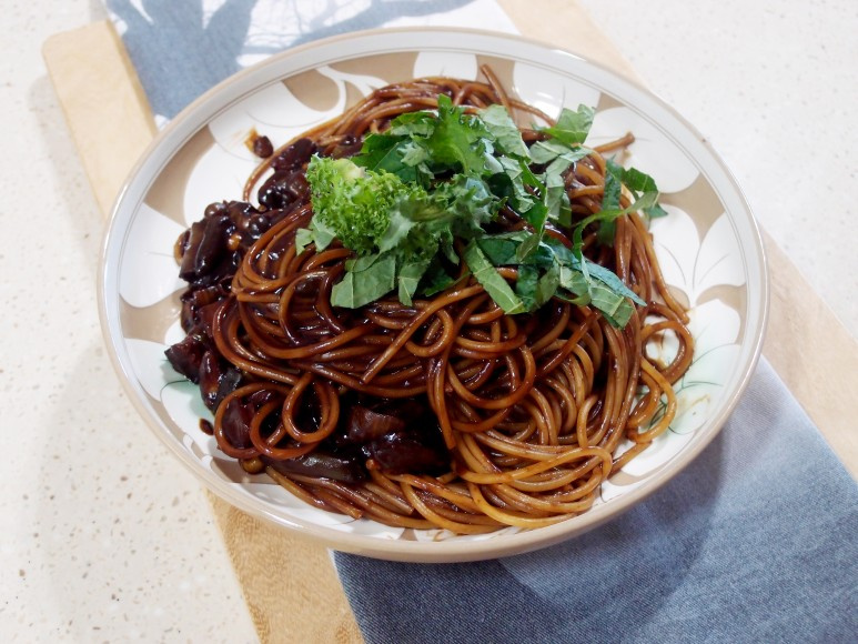 ¡Experimenta la deliciosa fusión de nuestra sencilla salsa Jjajang y la pasta italiana! Tus ‘Espaguetis a la Jjajang’, un plato de pasta único de inspiración china, ¡está completo! Como toque final, espolvorea las hojas de perilla cortadas en juliana fina por encima. Su aroma fresco y su vibrante color verde añaden un contraste hermoso y una capa extra de sabor. (Alternativamente, puedes usar pepino cortado en juliana. Un huevo frito podría no ser el mejor acompañamiento para los Espaguetis Jjajang, ¡en mi opinión!)