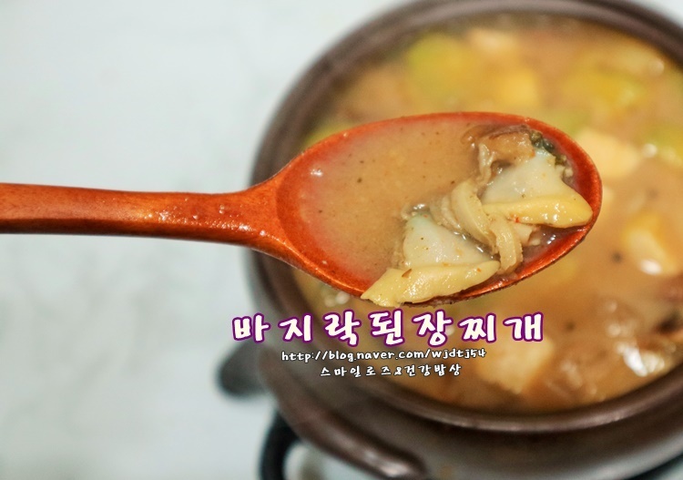 En una olla, ponga a hervir 4 tazas (800 ml) de agua con el trozo de alga seca. Una vez que hierva, retire el alga. Disuelva 1.5 cucharadas de doenjang a través de un colador en el agua. Agregue la patata en cubos, el calabacín y la seta shiitake rehidratada. Lleve a ebullición a fuego alto. Una vez que el caldo comience a hervir, añada las almejas purgadas. Cocine las almejas brevemente; se vuelven duras si se cocinan demasiado, así que agréguelas hacia el final.