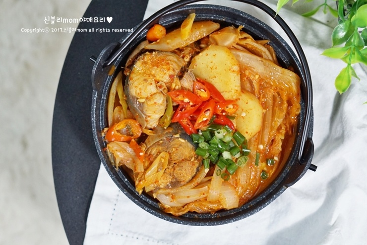 En una olla profunda, coloca las patatas (o el rábano) cortadas en el fondo. Coloca el kimchi añejo encima de las patatas, seguido de la cebolla cortada. Vierte la mezcla de condimentos preparada uniformemente sobre las verduras. Añade suficiente caldo de kombu para cubrir casi por completo la caballa; los ingredientes liberarán su propio líquido al cocinarse, así que evita añadir demasiado caldo al principio. Tapa la olla con una tapa.