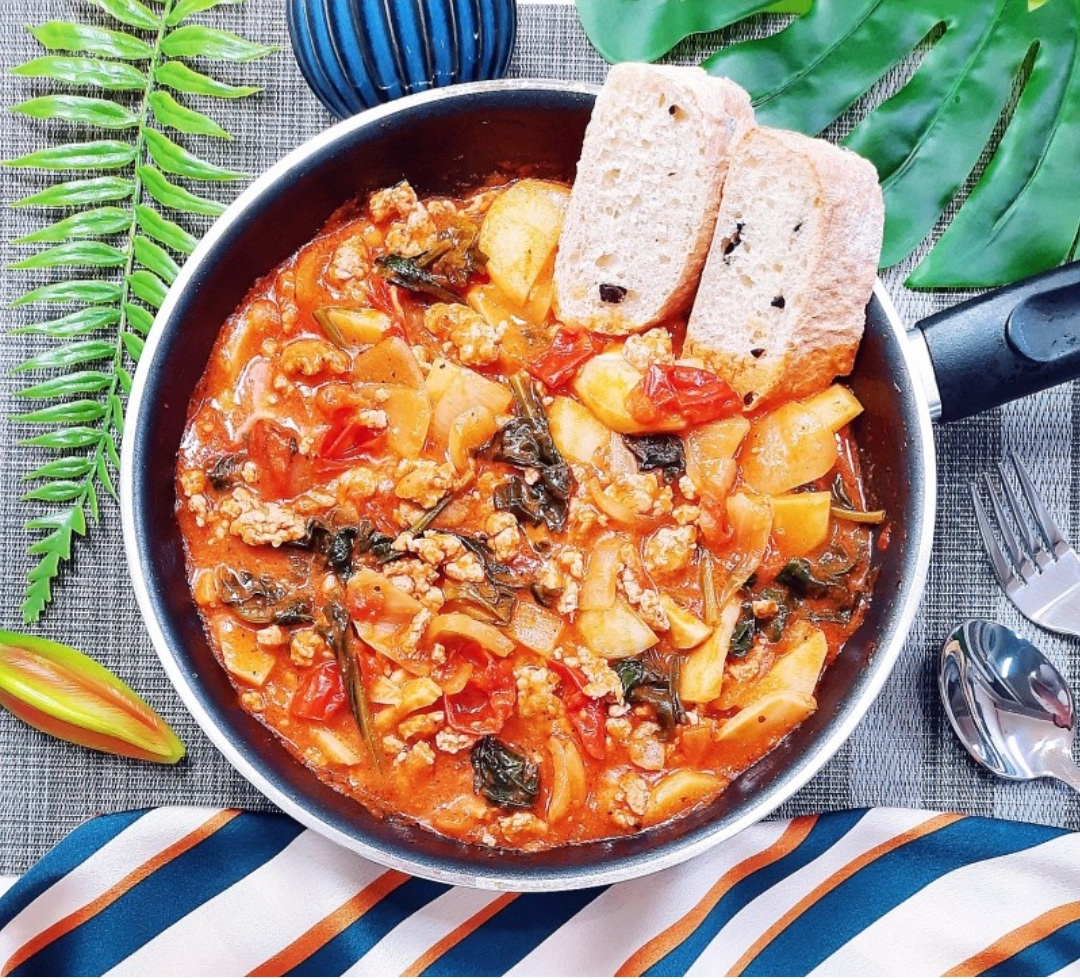 ¡Y aquí lo tienen: un estofado de cerdo con tomate abundante y delicioso, repleto de generosas cantidades de cerdo y una colorida variedad de verduras! Tomemos una gran cucharada. Los sabores de todos los ingredientes se han armonizado maravillosamente, creando una reconfortante calidez. Mojar un trozo de pan crujiente en el rico estofado y disfrutarlo con las tiernas verduras es increíblemente satisfactorio. Este estofado es perfecto para una comida de fin de semana relajante, quizás para compartir con sus seres queridos con una copa de vino mientras se ponen al día. ¿Por qué no probar esta maravillosa receta?