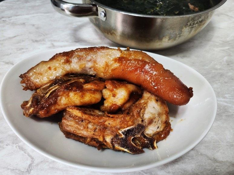 Coloca las colas de cerdo limpias en una olla y escáldalas por primera vez. Para eliminar eficazmente cualquier olor fuerte y ablandar la carne, añade 1 cucharada de doenjang, 1/2 taza de mirin y 3 hojas de laurel al agua. Esta cocción inicial ayuda a neutralizar sabores no deseados.