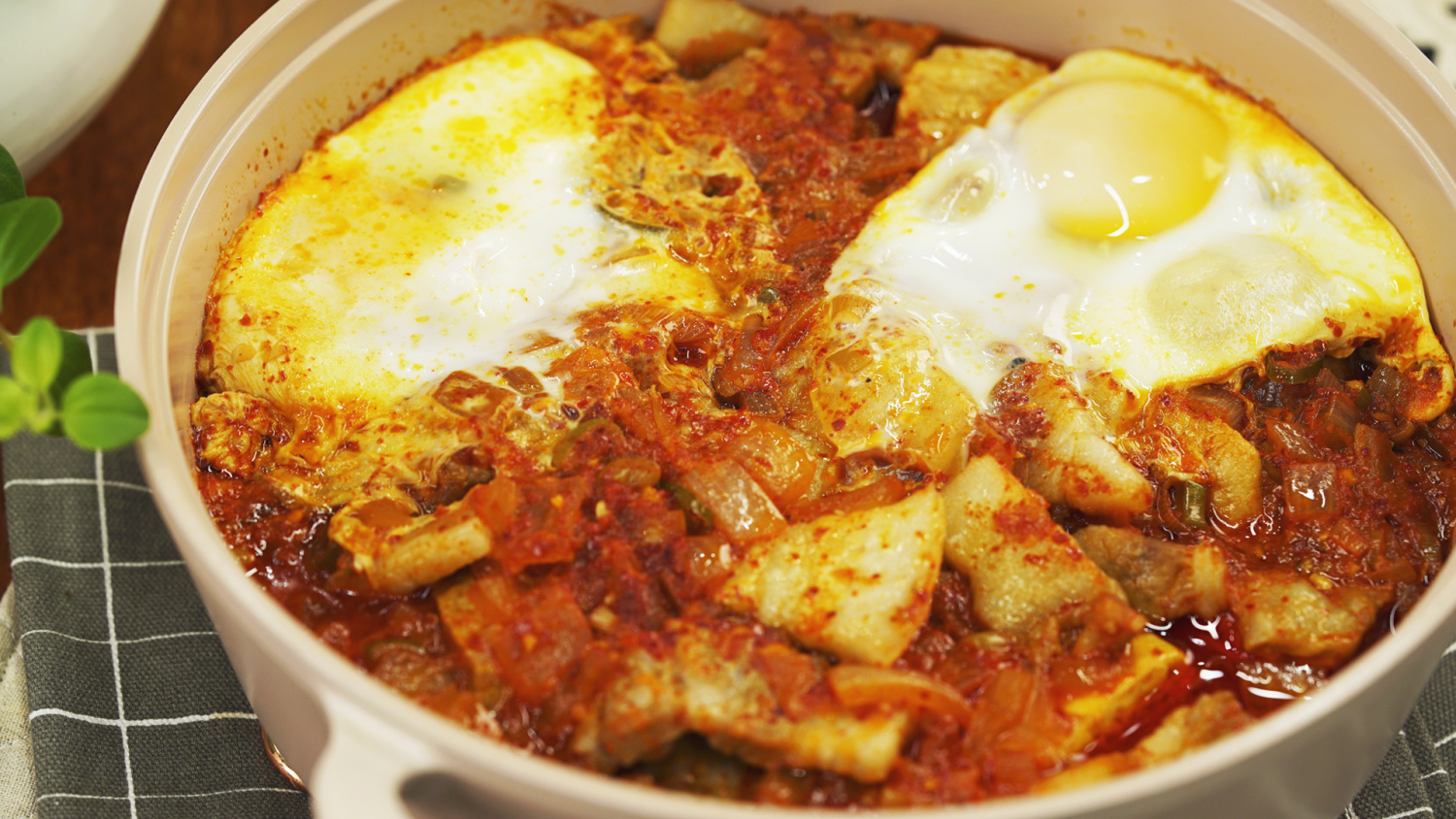 Finalmente, rompa los 2 huevos directamente en el estofado burbujeante. Cubra la olla nuevamente y cocine durante otros 2-3 minutos, o hasta que las claras de huevo estén cuajadas pero las yemas aún estén líquidas (huevo pasado por agua). Esto completa su delicioso estofado de panceta de cerdo y tofu. Puede romper la yema y mezclarla con la sabrosa salsa para un sabor extra rico. (El ingrediente opcional ‘Man-gae-han-al’ se refiere a la yema de huevo).
