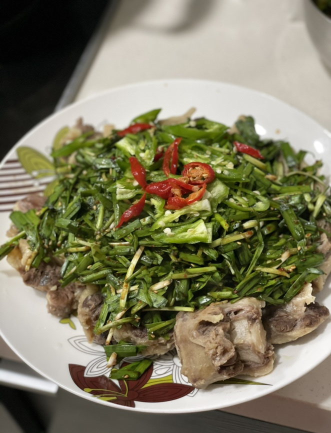 Una vez que el rabo de toro esté perfectamente tierno, cubre generosamente el rabo de toro estofado con la ensalada de cebollino preparada. La vibrante combinación del rico rabo de toro y los frescos cebollinos verdes crea un plato visualmente atractivo y apetitoso.