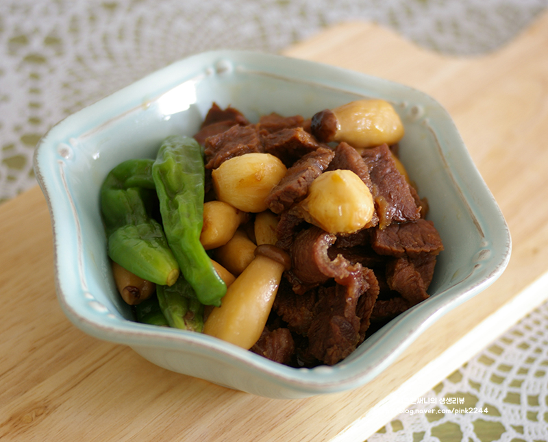 Este es un delicioso plato coreano de ternera estofada, con tierna carne de res, pimientos verdes coreanos (ggwari gochu) ligeramente picantes y crujientes, y sabrosos champiñones. Es un banchan (acompañamiento) perfecto para tener a mano en el refrigerador, haciendo que cada comida sea más satisfactoria.