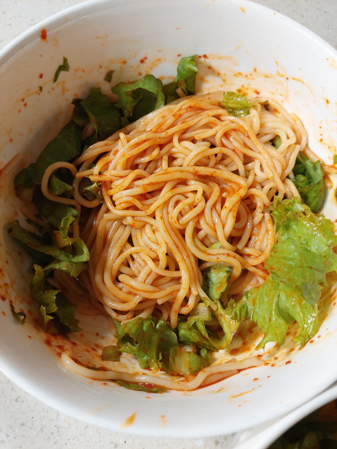 En un bol grande para mezclar, coloca los fideos Jjolmyeon preparados y la lechuga picada. Vierte generosamente la salsa preparada sobre los fideos y la lechuga. Usando tus manos, mezcla suavemente todo hasta que los fideos y las verduras estén uniformemente cubiertos con la salsa. Mezcla bien hasta que cada hebra de fideo esté infusionada con el delicioso sabor. ¡Tus deliciosos Jjolmyeon están ahora listos para ser disfrutados!