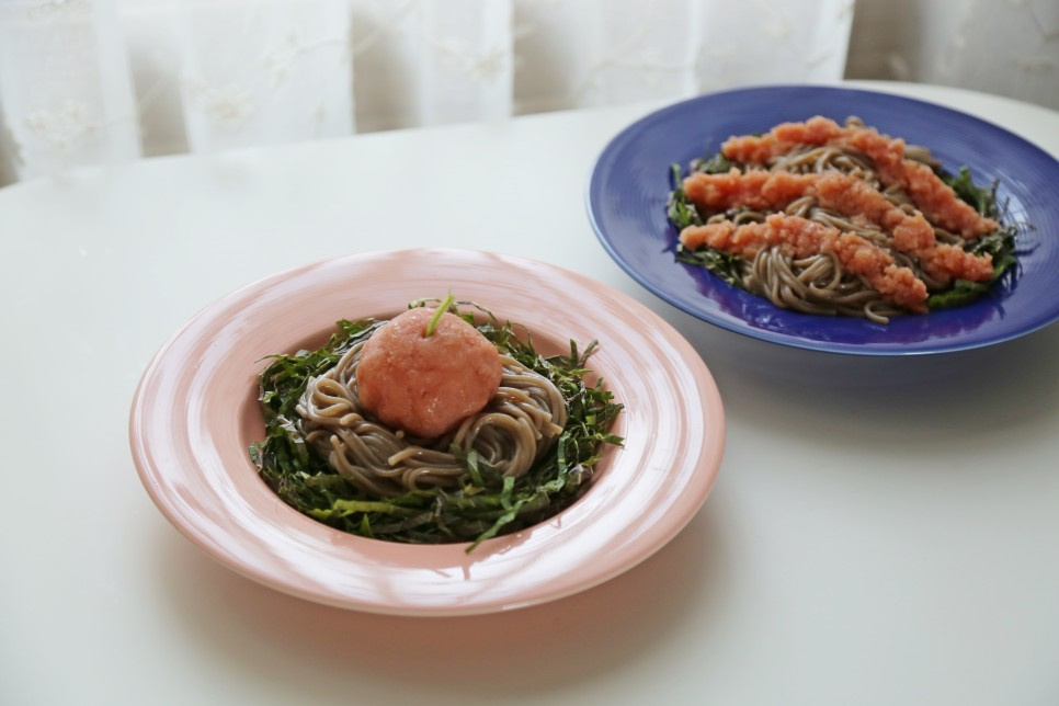 Coloca los fideos de trigo sarraceno fríos y escurridos cuidadosamente sobre las hojas de perilla en el bol. Añade la hueva de abadejo baja en sal por encima, ya sea desmenuzándola en trozos o colocándola entera. Finalmente, rocía la salsa de aceite de perilla y Tsuyu preparada sobre los fideos. Mezcla todo al gusto y disfruta de este delicioso plato. Si lo deseas, puedes añadir alga nori desmenuzada o semillas de sésamo para un sabor adicional.