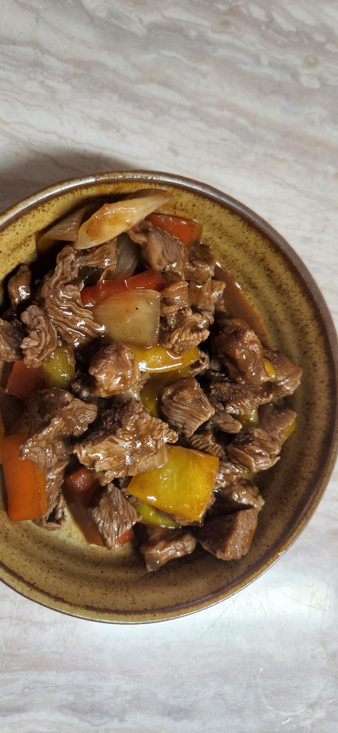 Una vez que la carne y las verduras estén cocidas a tu gusto y hayan acumulado jugos deliciosos en la sartén, vierte la mezcla de salsa preparada. Reduce el fuego a bajo y continúa cocinando durante unos 5-10 minutos, revolviendo ocasionalmente, para que la salsa cubra todo de manera uniforme. La salsa espesará y le dará un hermoso brillo a la carne.