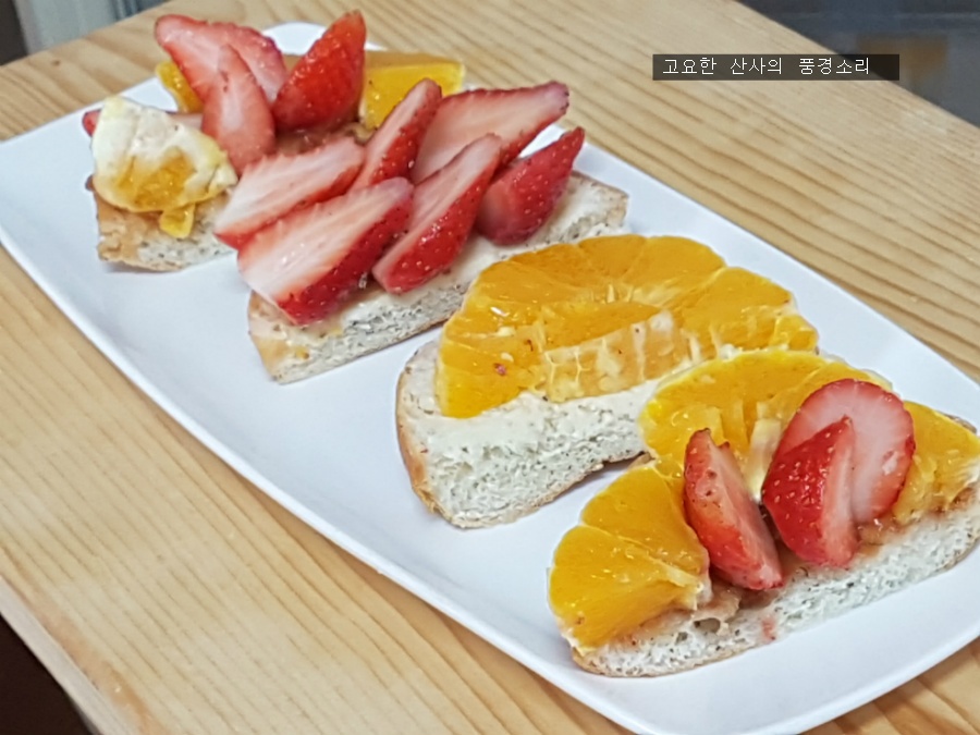 Coloca las fresas frescas cortadas y los gajos de naranja (pelados y sin membranas) de forma atractiva sobre una de las mitades de pan preparadas. La frescura y los vibrantes colores de las frutas harán que el sándwich sea aún más apetitoso. Una vez colocadas todas las frutas, cubre con la otra mitad del pan para completar el sándwich.