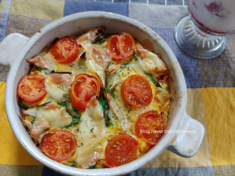 Coloca los tomates cherry cortados por la mitad y la loncha de queso sobre la mezcla de frittata. (Consejo: Para un sabor más dulce, puedes saltear ligeramente los tomates cherry antes de añadirlos.) Hornea en un horno precalentado a 180°C (350°F) durante unos 20 minutos, o a 200°C (400°F) durante menos de 15 minutos, hasta que la parte superior esté dorada y cuajada. Ajusta el tiempo de horneado según el rendimiento de tu horno.