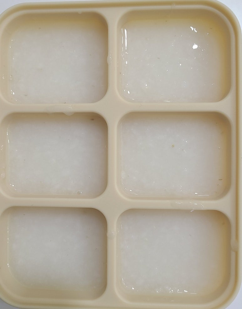 Una vez enfriadas, porciona las gachas de arroz terminadas en cubos para comida de bebé de 50 ml para congelarlas fácilmente. Para las porciones a servir al día siguiente, guarda unos 50 g en recipientes individuales para comida de bebé en el refrigerador.