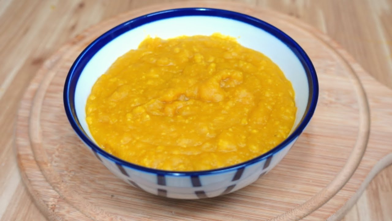 En una olla, combine la calabaza dulce triturada con 600 ml de agua. Revuelva bien para mezclar. Si la mezcla parece demasiado espesa, puede añadir un poco más de agua.