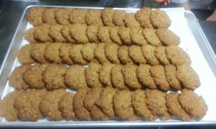 Hornea en un horno precalentado a 170°C (340°F) durante 16 minutos. El tiempo y la temperatura de horneado pueden variar según tu horno. Mientras las galletas se hornean, puedes preparar una rejilla de enfriamiento o una bandeja perforada cubriéndola con papel de hornear. Esto facilitará la transferencia de las galletas calientes.