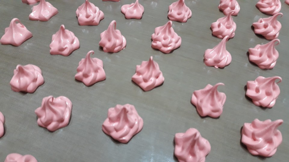 La mezcla de merengue terminada debe ser muy firme, tanto que no se caiga al invertir el bol. Las marcas de la batidora deben permanecer claramente visibles y los picos deben mantenerse rectos. Este nivel de firmeza es crucial para que las galletas de merengue mantengan su forma.