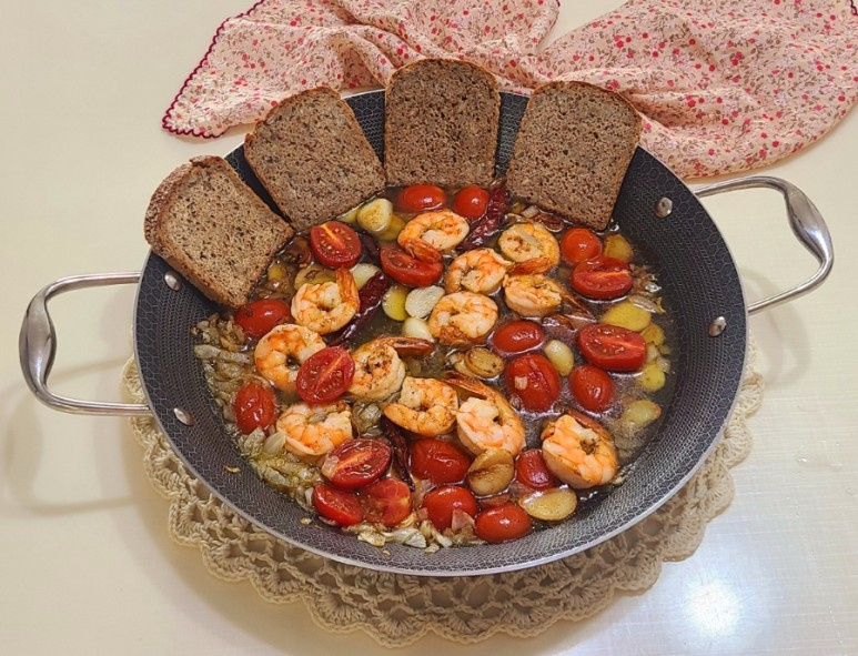 Cubrir su pan con los camarones jugosos y perfectamente cocidos crea un bocado delicioso, donde el rico aceite de oliva y los sabores sabrosos del camarón se funden para un gusto inolvidable. ¡Es un plato de calidad de restaurante que puede crear fácilmente en casa!