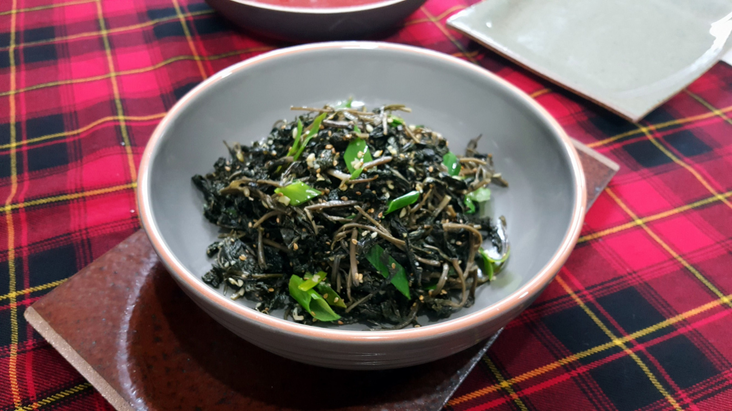 Una vez que el Gondre namul esté cocido a tu gusto, apaga el fuego. Ahora es el momento de añadir los toques finales utilizando el calor residual. Incorpora las cebolletas picadas finamente, las semillas de sésamo y el aceite de perilla. Usa palillos para mezclar suavemente; esto evita que el namul se apelmace y asegura que todo esté combinado uniformemente. ¡El fragante aroma del aceite de sésamo indicará que está listo!