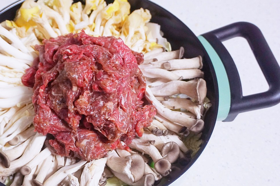 Coloca uniformemente la ternera marinada sobre las verduras en la olla. Vierte 600 ml de caldo de anchoas y algas. Si planeas servir el guiso después de cocinarlo previamente, en lugar de cocinarlo en la mesa, es mejor saltear primero ligeramente la ternera y la cebolla, y luego añadir las setas y la col más tarde para mantener una mejor textura de las verduras. Sin embargo, hoy, como este guiso de setas es para la abuela, todos los ingredientes se añadirán a la vez para cocinar a fuego lento y desarrollar un sabor profundo. Cocinar todo junto permite que los ingredientes mezclen sus sabores, creando un sabor más profundo.