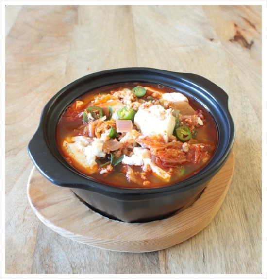 Ahora, sube el fuego al máximo y lleva el guiso a ebullición viva. Una vez que hierva, reduce el fuego a medio o bajo y cocina a fuego lento durante otros 5-7 minutos para permitir que los sabores se mezclen. Finalmente, añade las partes verdes picadas de la cebolleta y 2 chiles Cheongyang en rodajas. Cocina a fuego lento brevemente, ¡y tu picante y refrescante guiso de tofu con kimchi estará listo! Disfrútalo muy caliente.