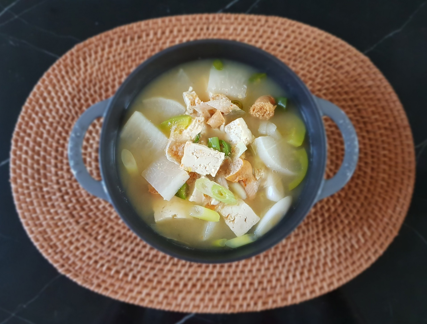 Cuando el guiso esté casi listo, añade los chiles verdes coreanos para un toque picante, las fragantes cebolletas y el ajo picado. Cocina a fuego lento brevemente para que los sabores se mezclen, luego apaga el fuego.