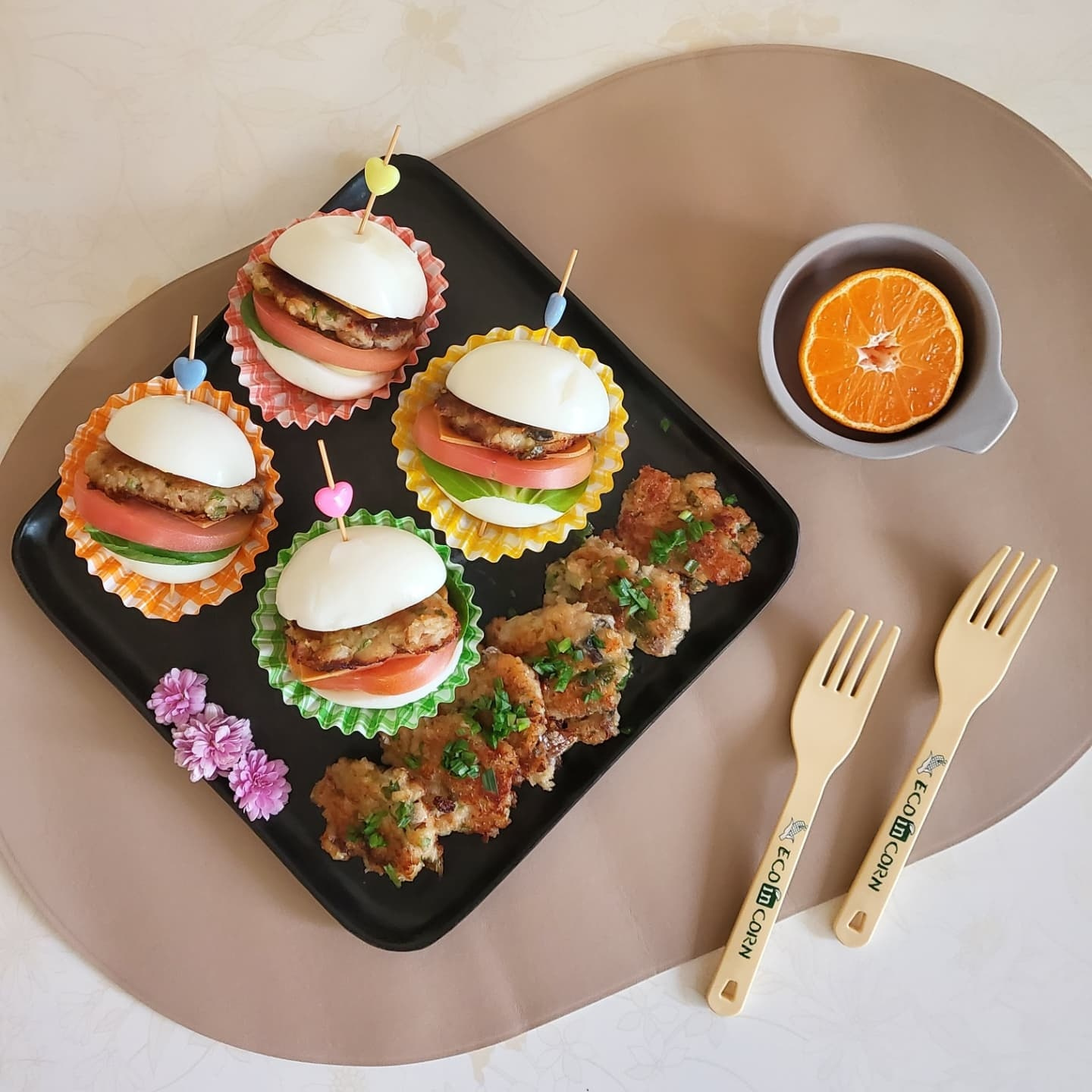 Coloca cuidadosamente las elaboradas hamburguesas de huevo de caballa noruega en un bonito plato cuadrado. ¿Los colores vibrantes se ven realmente apetitosos, verdad?