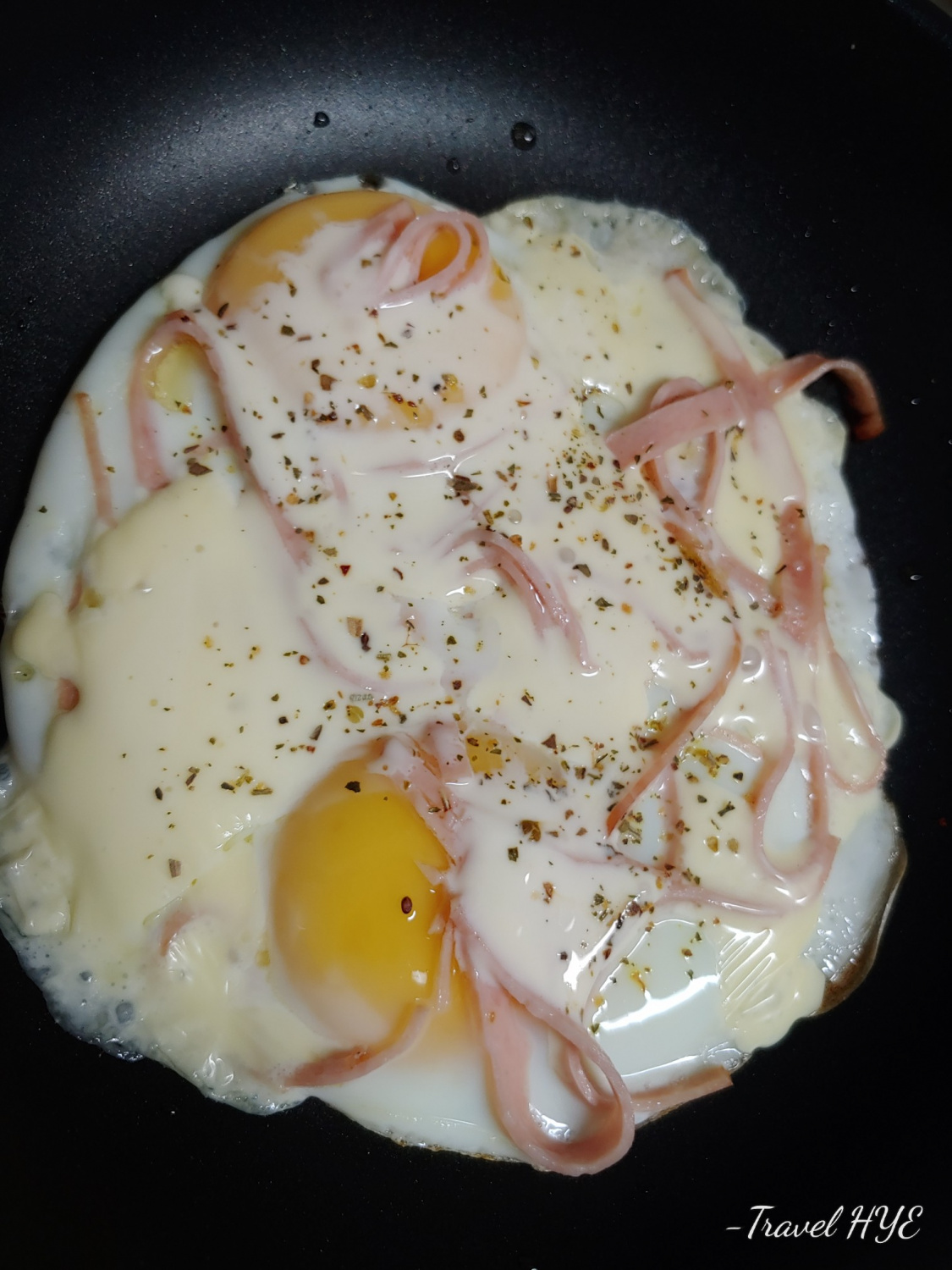 Primero, precalienta tu sartén a fuego medio-bajo durante unos 30 segundos. Una vez que la sartén esté tibia, añade 1 cucharada de aceite de oliva y gírala para cubrir el fondo. Casca con cuidado 2 huevos en la sartén. (En este punto, cuando las claras del huevo comiencen a cuajar y se vuelvan opacas, como se muestra en la foto, es el momento de añadir el jamón. El orden de cocción es: Sartén – Aceite – Huevo – Jamón. Inmediatamente después de colocar los huevos en la sartén, corta la loncha de jamón en trozos deseados y colócala directamente sobre los huevos. Cocina durante unos 30 segundos a 1 minuto).