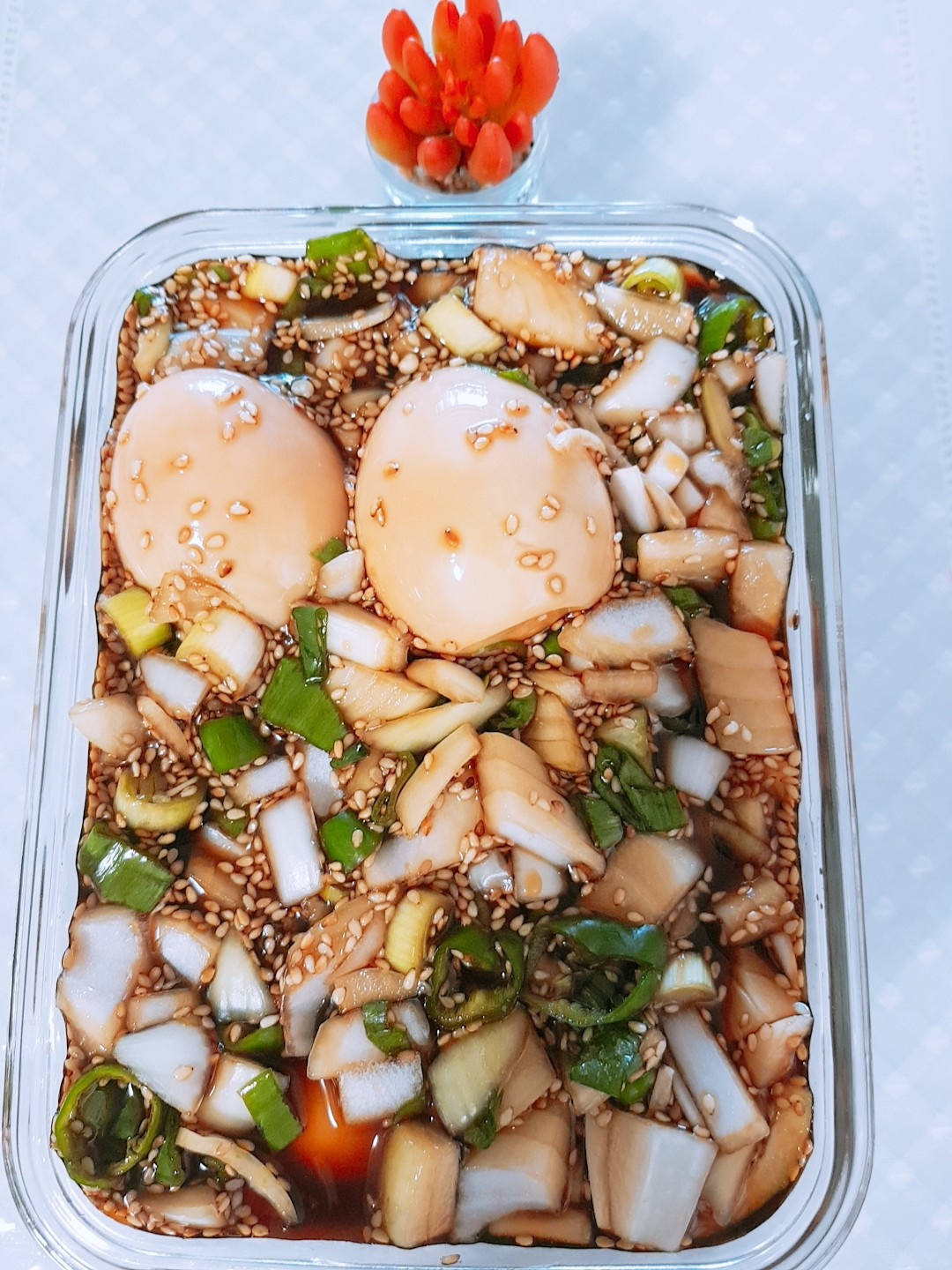 Coloque los huevos al vapor cocidos, la cebolla picada, la cebolleta y los chiles en un recipiente de vidrio limpio. Asegúrese de que los huevos queden sumergidos en el aderezo. Si flotan demasiado, puede colocar un plato pesado encima para mantenerlos bajo el líquido.