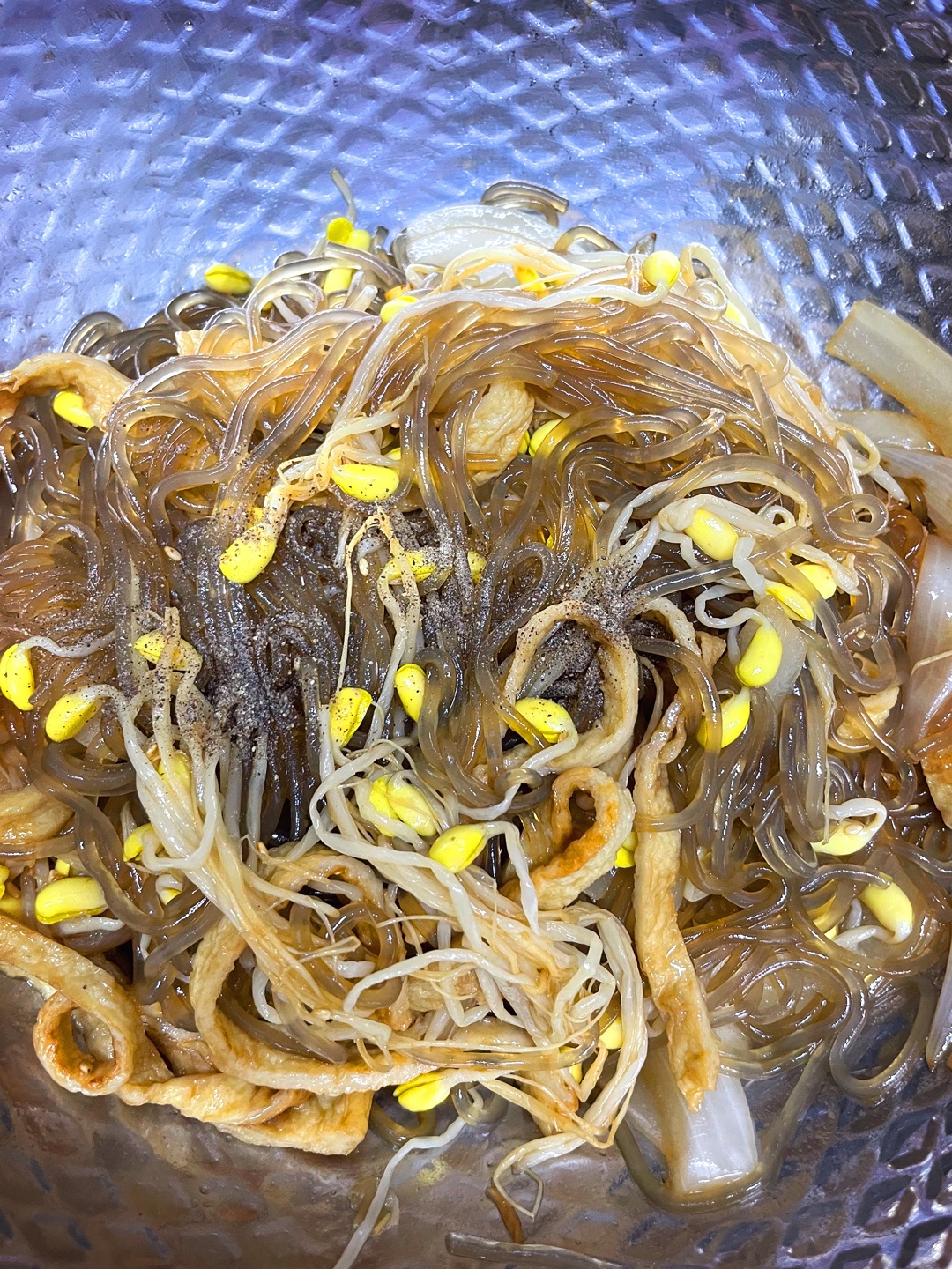 Puedes añadir una pizca de pimienta negra al final para darle más sabor, si lo deseas. Sirve el Japchae de brotes de soja caliente.