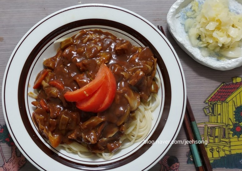 Sirve los fideos espagueti cocidos en un bol. Vierte generosamente la salsa jjajang caliente y casera sobre los fideos. Decora con rodajas finas de tomate, ¡y tu delicioso Jjajangmyeon Secreto con Miso estará completo!