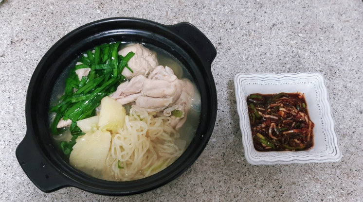 ¡Tu Kal-guksu de pollo con caldo rico y profundo, junto con la salsa condimento preparada por expertos, está ahora completo! Disfruta de una comida satisfactoria y deliciosa con el caldo humeante. ^^
