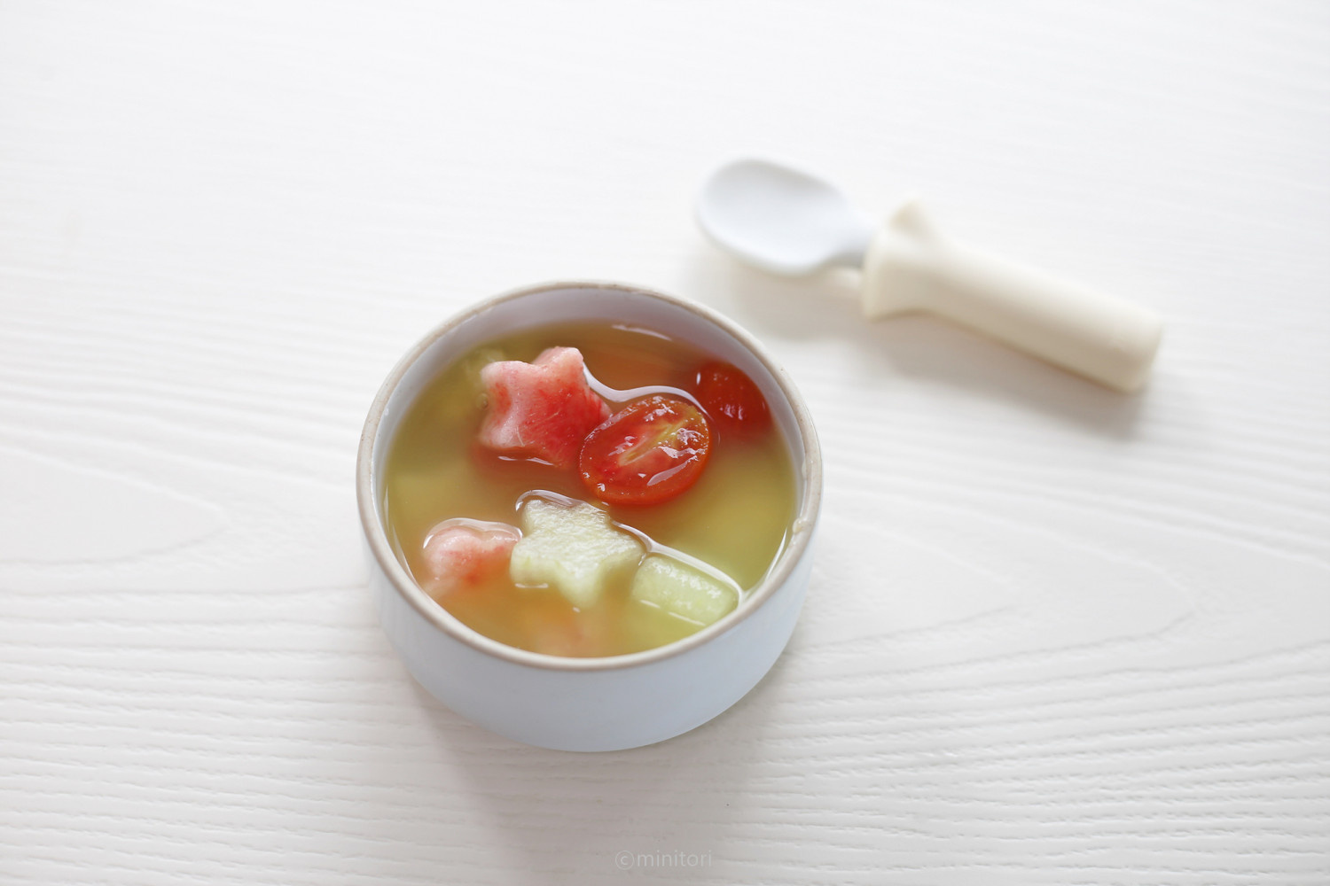 Ahora prepararemos el kimchi de agua con frutas que le gustan a tu bebé. He preparado tomates cherry, melocotones amarillos y melón, que son favoritos para muchos bebés. Siéntete libre de sustituir con otras frutas que tu bebé disfrute, como fresas, albaricoques o kiwis. Para los tomates cherry, es mejor escaldarlos y quitarles la piel, ya que pueden ser difíciles de comer para los bebés.