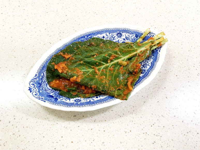 Ahora es el momento de ensamblar el kimchi de col rizada. Tome una hoja de col rizada a la vez y extienda la pasta de kimchi preparada uniformemente sobre su superficie. De manera similar a como se hace el kimchi de hoja de perilla, extienda una fina capa de pasta sobre una hoja de col rizada, luego coloque otra hoja de col rizada encima y repita el proceso, asegurándose de que todas las hojas de col rizada estén cubiertas con la pasta. Si las hojas son grandes, puede doblarlas por la mitad antes de untar la pasta.