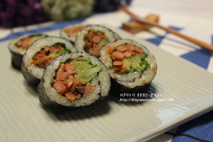 ¡Aquí tienes un sencillo y delicioso Kimbap de Kimchi y Jamón, perfecto para cuando no tienes mucho apetito! La maravillosa combinación de pepino crujiente, kimchi ácido y jamón sabroso hará que tus papilas gustativas canten de alegría. ¡Disfruta de este kimbap especial con toda tu familia!