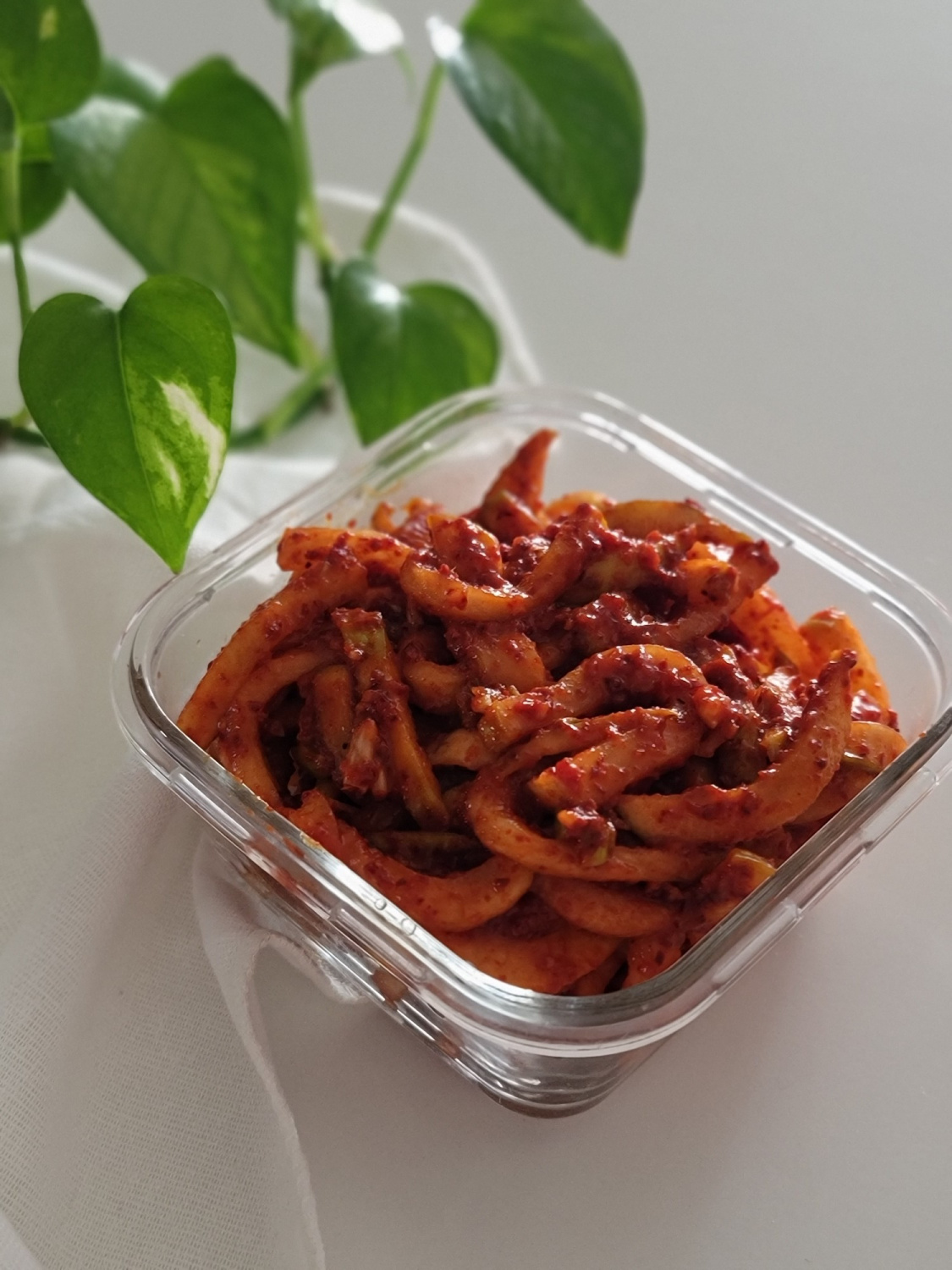 Este kimchi de rábano estilo Bossam no solo es un acompañamiento perfecto para Bossam (rollitos de cerdo hervido coreano) y Suyuk (lonchas de cerdo hervido), sino que también combina maravillosamente con panceta de cerdo a la parrilla. Su textura única, crujiente y masticable, lo convierte en un excelente plato de acompañamiento para cualquier comida. Disfrute del sabor fresco del rábano combinado con un condimento sabroso y lleno de sabor que estimulará su apetito. Prepare este delicioso y especial kimchi de rábano fácilmente en casa.