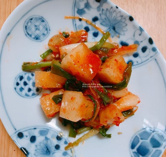 La clave de esta receta de kkakdugi es su simplicidad: ¡no es necesario hacer una pasta de almidón! Después de mezclar las cebollas y las cebolletas en la pasta de aderezo, añade el rábano salado y escurrido y,