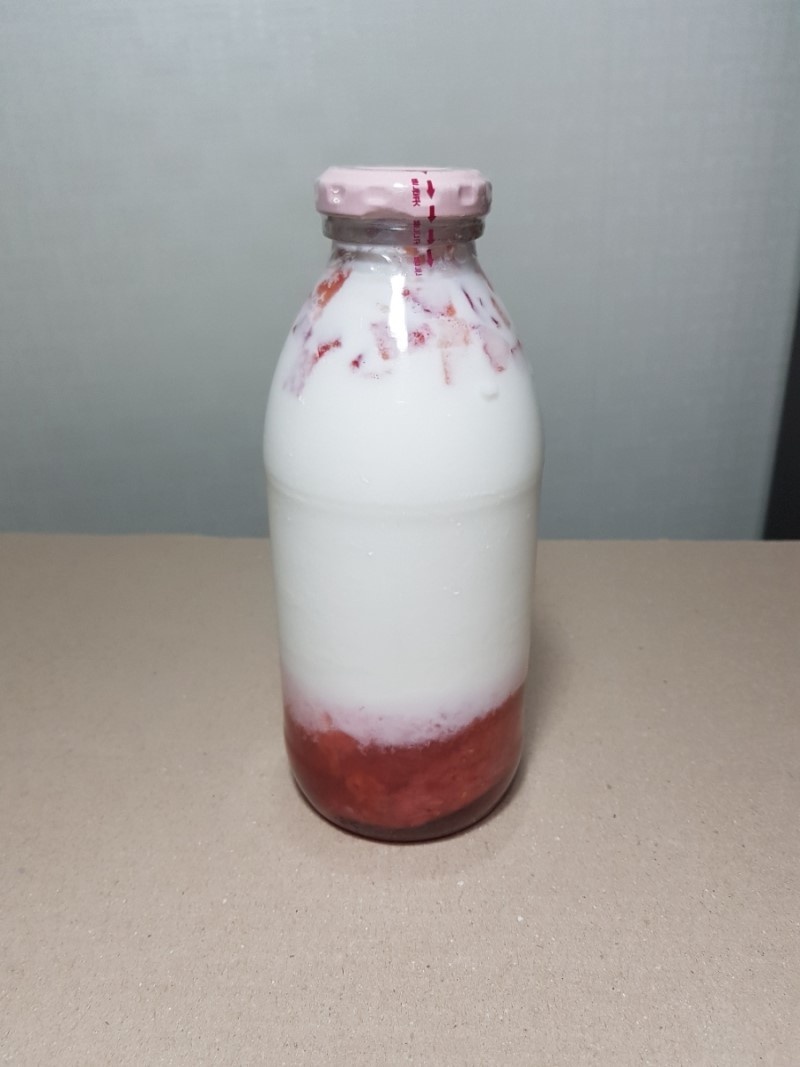 Prepara 4 botellas de vidrio y esterilízalas bien (puedes hervirlas o usar el lavavajillas). Coloca una capa del sirope de fresa preparado en el fondo de cada botella esterilizada.