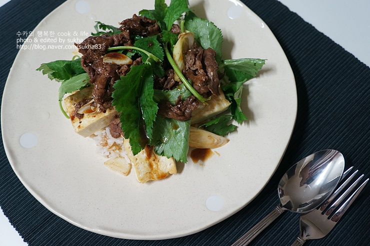 ¡Todos los componentes están listos! Sirva arroz cocido caliente en un bol. Coloque las rodajas de tofu frito dorado sobre el arroz. A continuación, añada generosamente el apio de hoja (chamnamul) lavado. Coloque el bulgogi cocido y las láminas de ajo salteado sobre el chamnamul. Finalmente, rocíe uniformemente la salsa de aderezo de bulgogi espesada sobre todo. ¡Su lujoso Bol de Arroz con Tofu Bulgogi está completo! Disfrute de esta deliciosa comida.