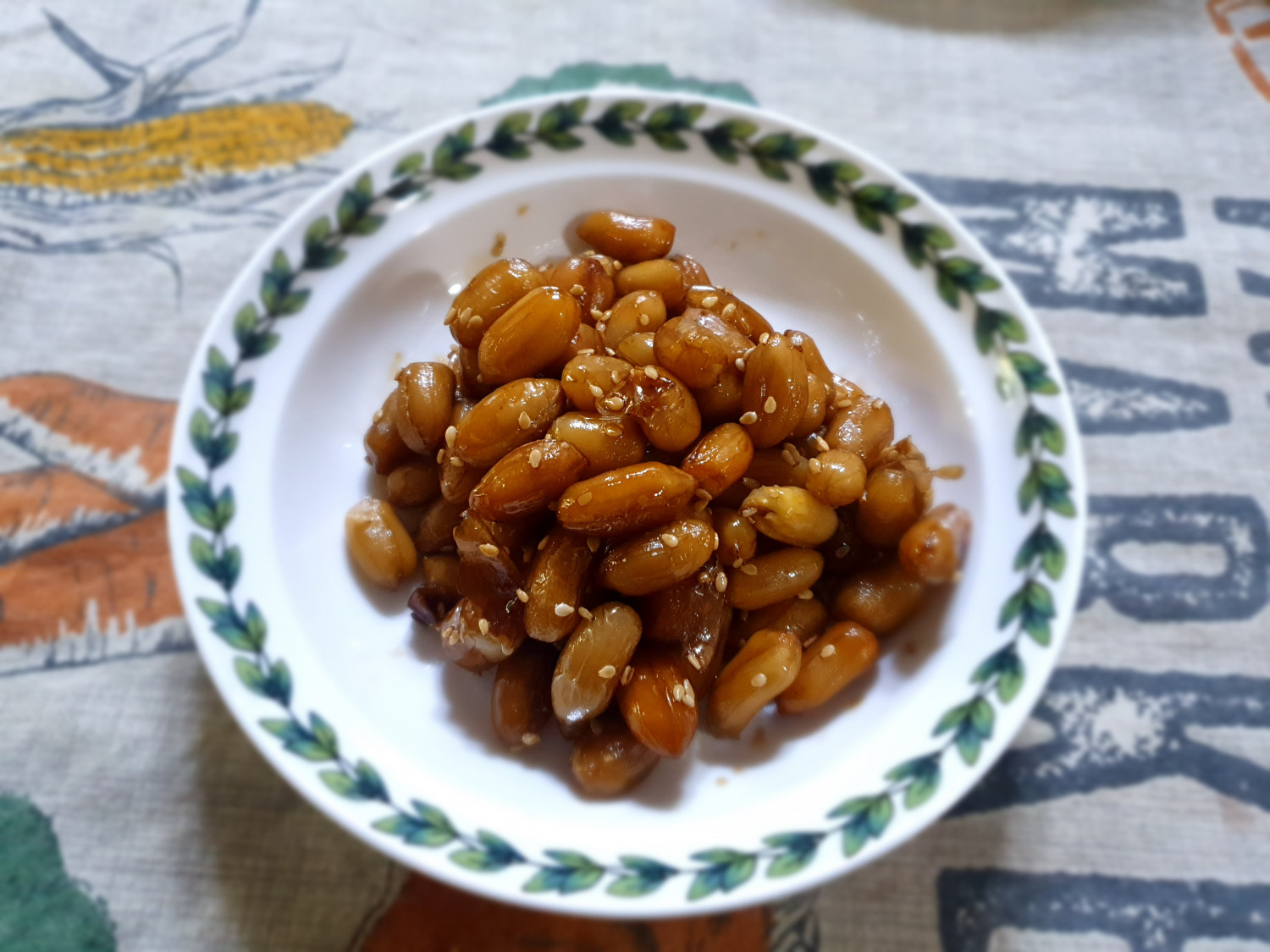 Una vez que los cacahuates estén bien cubiertos con el glaseado y luzcan brillantes, estarán casi listos. Justo antes de apagar el fuego, espolvorea generosamente con semillas de sésamo para un aroma adicional a nuez y mezcla suavemente. ¡Tus deliciosos cacahuates guisados están ahora completos! Deja que se enfríen completamente antes de transferirlos a un recipiente hermético y refrigerarlos.