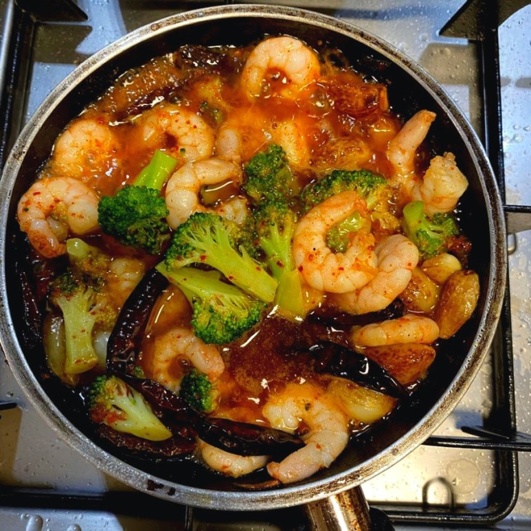 Cuando los ajos estén a medio cocinar y fragantes, añade los camarones marinados y los floretes de brócoli blanqueados a la sartén. Continúa cocinando a fuego bajo durante unos 3-5 minutos, o hasta que los camarones se pongan rosados y opacos, y los ajos estén ligeramente dorados. Evita cocinar los camarones en exceso para que no queden duros. Una vez cocidos, retira del fuego. Si deseas, puedes espolvorear un poco de perejil picado por encima. Sirve inmediatamente con rebanadas tostadas de pan de centeno o baguette, perfectas para mojar en el delicioso aceite infusionado con ajo. ¡A disfrutar!