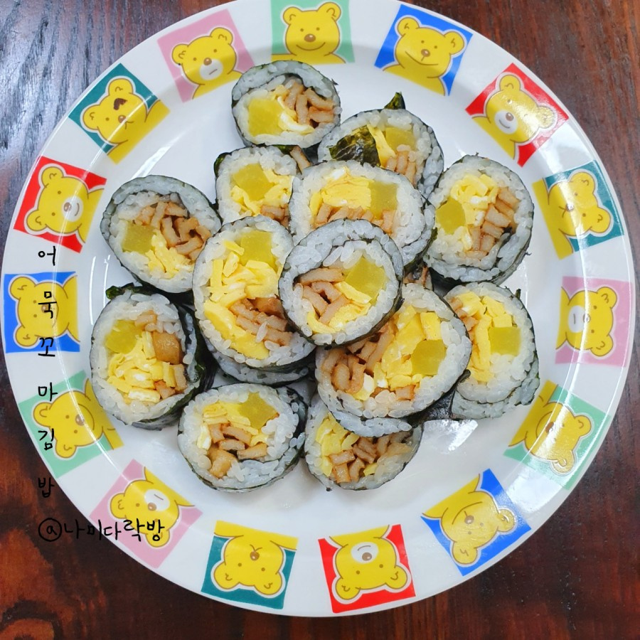 Coloquen el pastel de pescado glaseado con salsa de soja preparado, el rábano encurtido y las tiras de huevo sobre el arroz. Humedezcan el borde del alga con un poco de agua y enróllenlos firmemente para formar el mini gimbap. ¡Está completo!