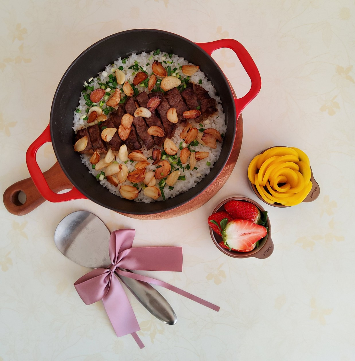 ¡Listo! Su deliciosa Olla de Arroz con Filete está preparada. Disfrute de esta maravillosa comida donde el filete tierno, el arroz perfectamente cocido y el sabroso ajo se unen en perfecta armonía. También puede servirla con su salsa favorita.