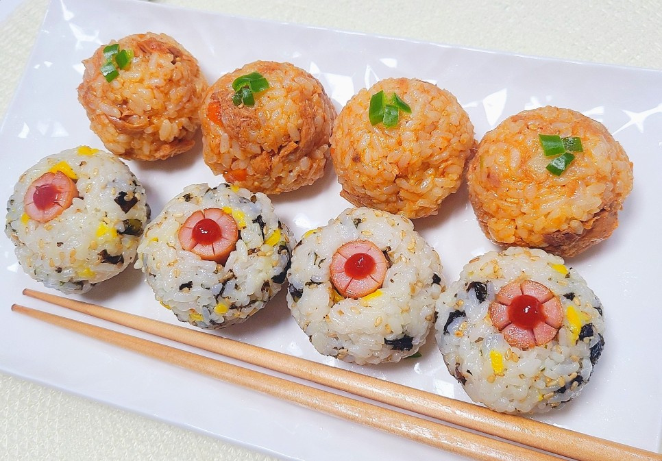Ahora, organiza artísticamente los dos tipos de onigiri en un plato para servir. Para los onigiri de salchicha Viena en forma de flor, añade una pequeña cantidad de kétchup en el centro para darle un toque de color. Para los onigiri de atún picante, decora con una pequeña cantidad del chile Cheongyang picado que preparaste anteriormente.
