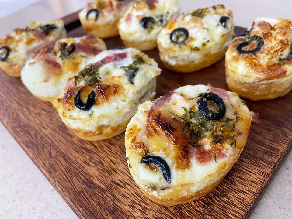 ¡Es hora de agregar los deliciosos ingredientes para cubrir! Distribuya uniformemente el tocino, jamón y queso picados sobre la masa en cada molde. Termine con una ligera pizca de perejil seco para una hermosa presentación y un toque de frescura. ¡Siéntase libre de agregar otros ingredientes como granos de maíz si lo desea!