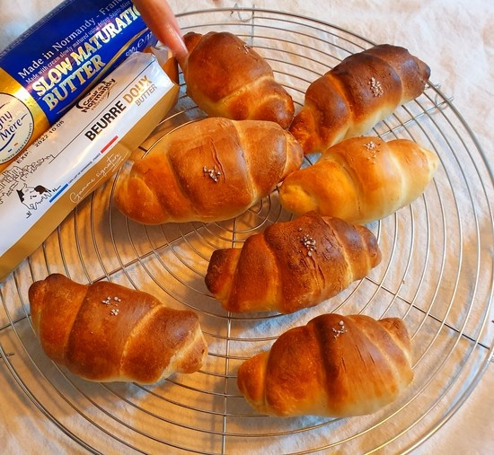 ¡Finalmente he preparado el Pan de Sal que está tan de moda en Seongsu-dong! Preparé mantequilla salada casera con mantequilla francesa Isigny y la masa con una mezcla de harina de trigo común para una textura suave y harina de fuerza para darle elasticidad. La sal visible en la superficie lo hace inconfundiblemente un Pan de Sal. ¡Me sorprendió que supiera igual que los que compro en Seongsu-dong! Es aromático, suave, elástico y sabroso. Su sabor adictivo me dan ganas de prepararlo varias veces más pronto.