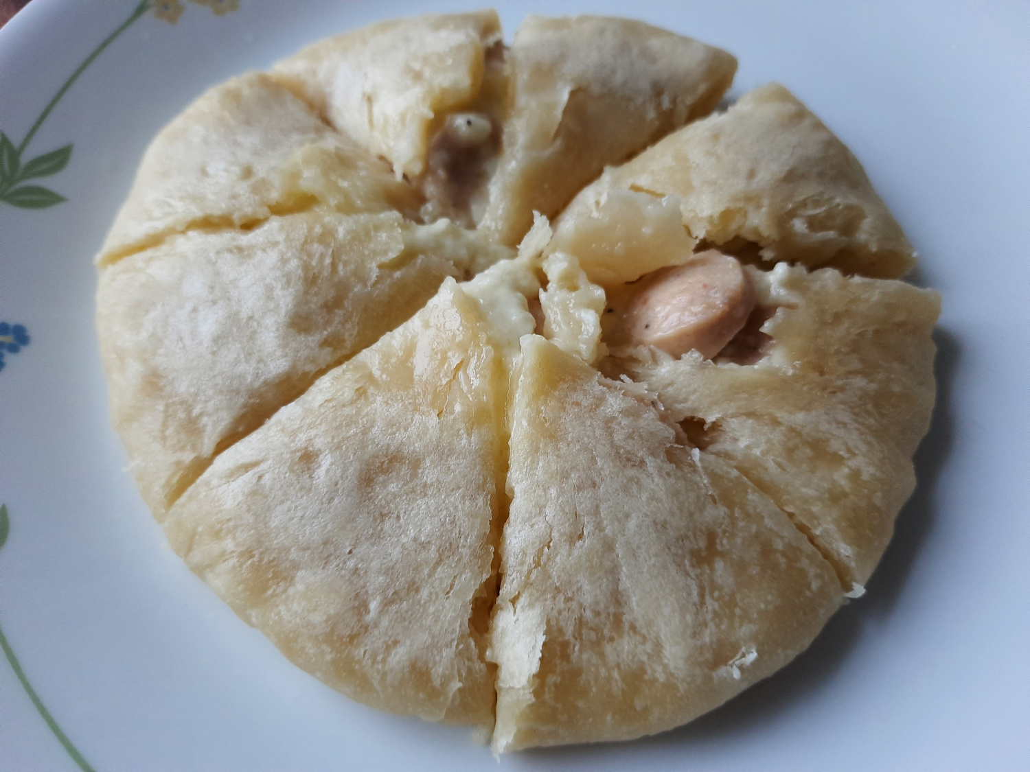 Extiende aproximadamente 20g (un puñado) de queso mozzarella descongelado uniformemente sobre la masa aplanada. Luego, corta la salchicha en rodajas y colócala encima del queso. ¡Siéntete libre de añadir otros rellenos como jamón si lo deseas!