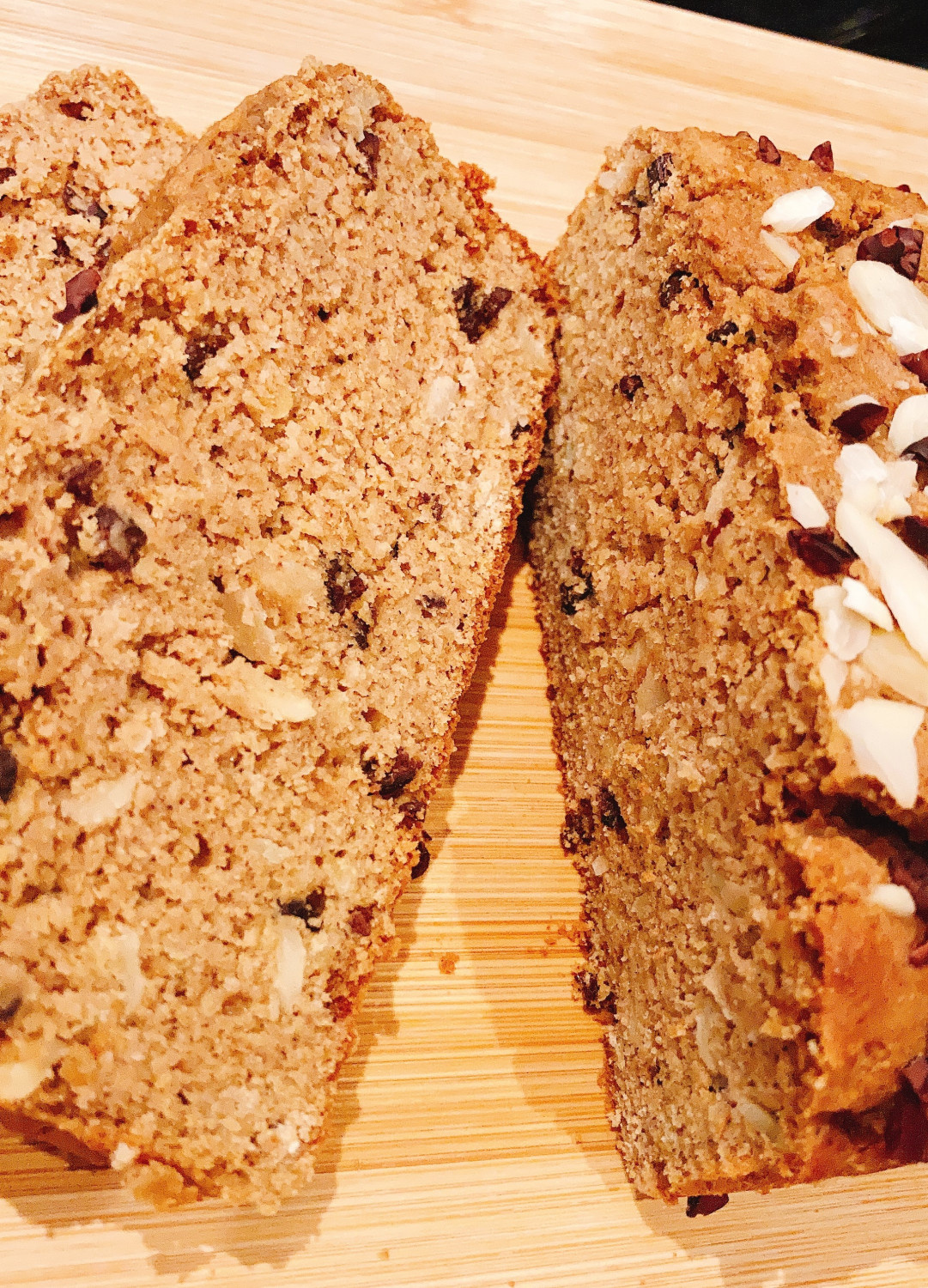 Al cortar el pan, verás una hermosa sección transversal con trozos de garbanzos, nibs de cacao crujientes y deliciosas almendras laminadas incrustadas por todas partes. ¡Disfruta de este pan saludable y sabroso!