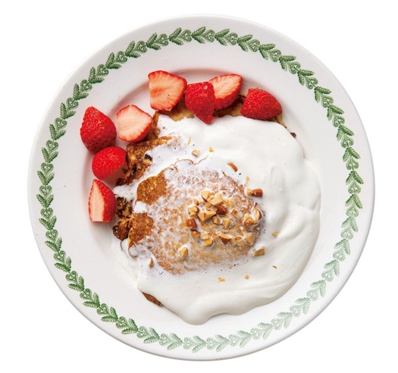Coloca los panqueques de avena cocidos en un plato de servir. Rocía generosamente la salsa de crema de coco caliente sobre los panqueques. Finalmente, decora con tus frutas frescas favoritas y 6 almendras picadas para un acabado hermoso y delicioso.